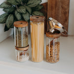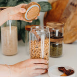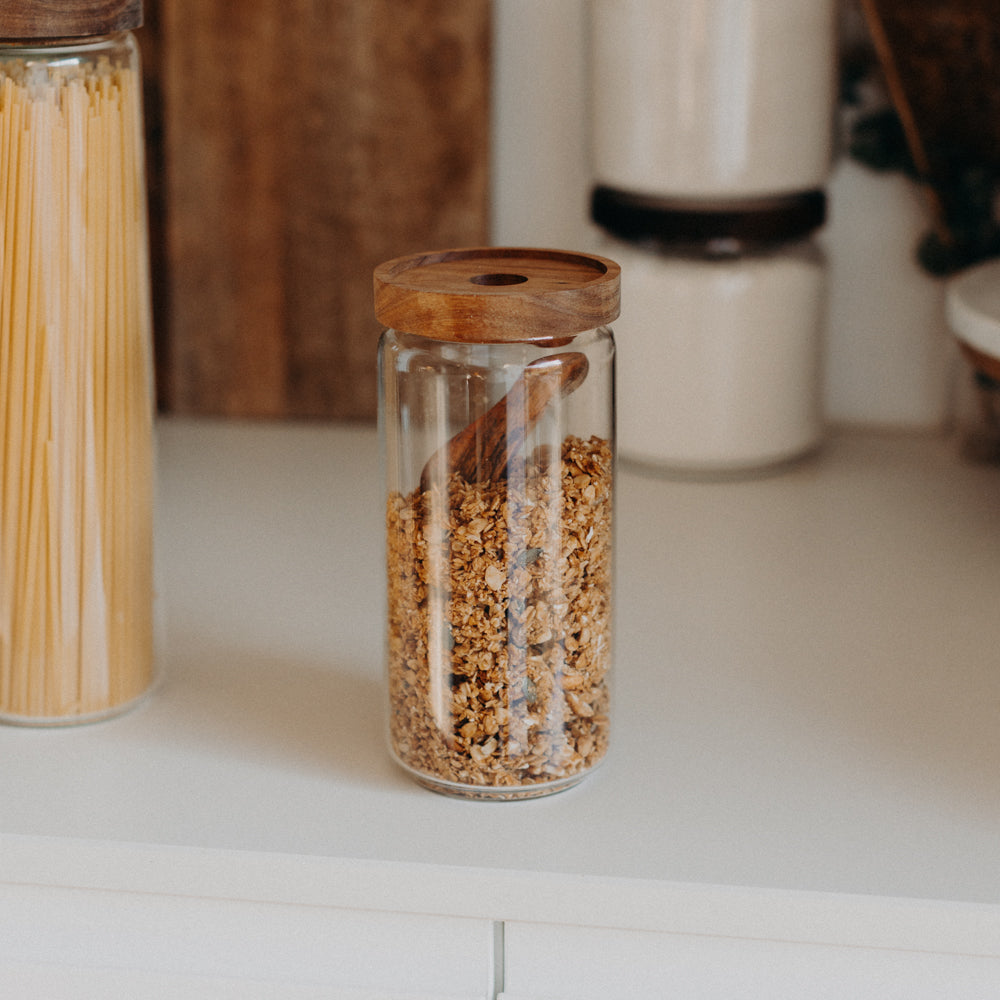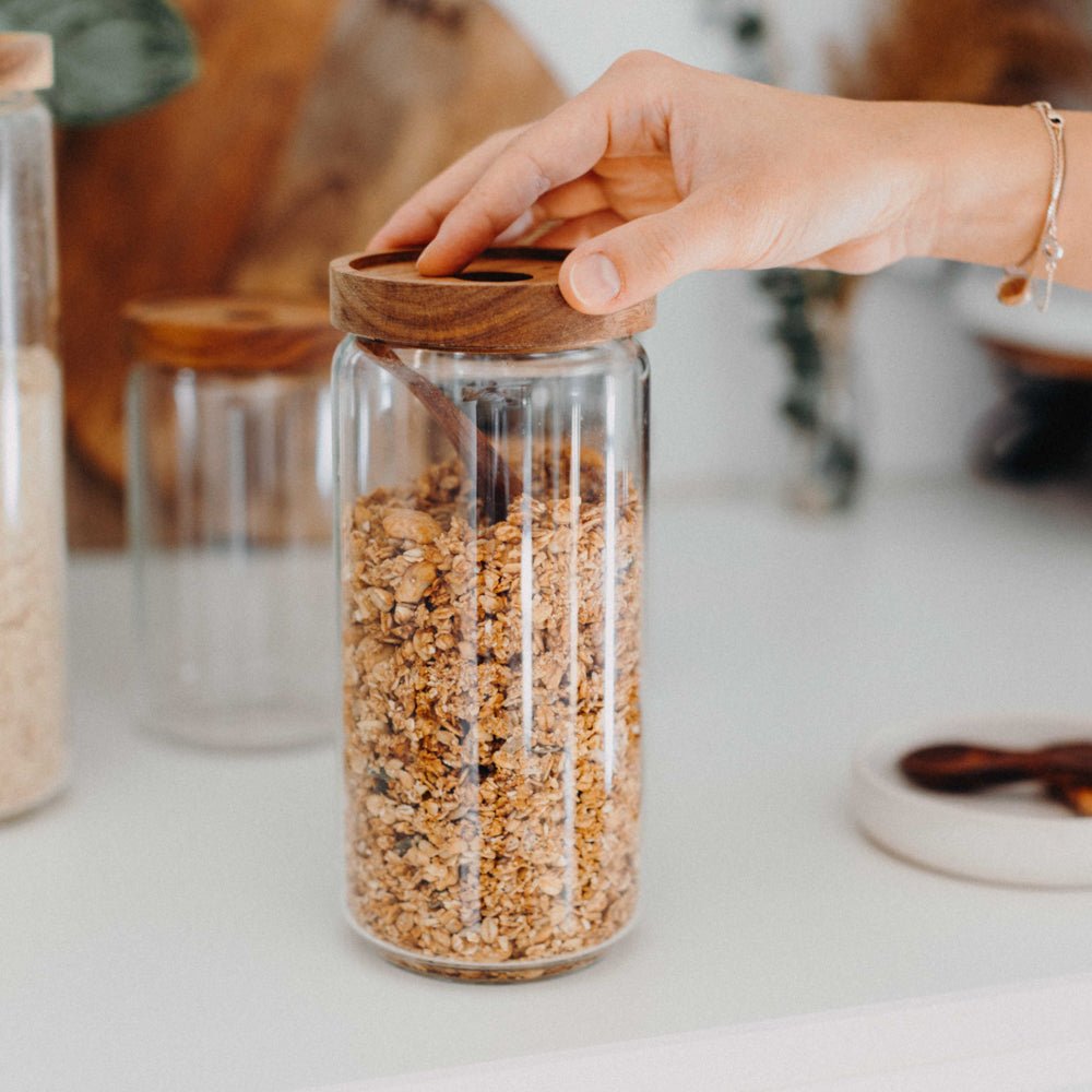 In den stapelbaren Vorratsgläser mit Akazienholzdeckel findet jede Zutat ihren Platz - ob Spaghetti, Haferflocken, Linsen oder Granola. Mit dem Trichter aus Edelstahl kannst du deine Gläser unkompliziert befüllen, ohne dass was daneben geht. Damit der Inhalt luftdicht verschlossen bleibt, ist im Deckel eine Silikonring versteckt, den man nicht sieht, aber dafür sorgt, dass deine Vorräte lange genießbar bleiben.
