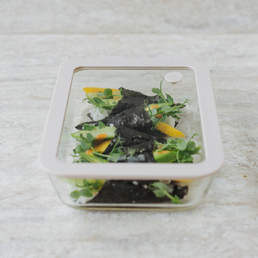 Der hochwertige Glasdeckel mit lebensmittelechtem Silikonrand und integriertem Ventil sorgt für einen luftdichten Verschluss der Frischeboxen – so bleiben deine Speisen länger frisch und sicher verstaut, auch unterwegs.