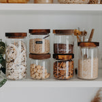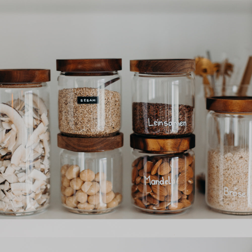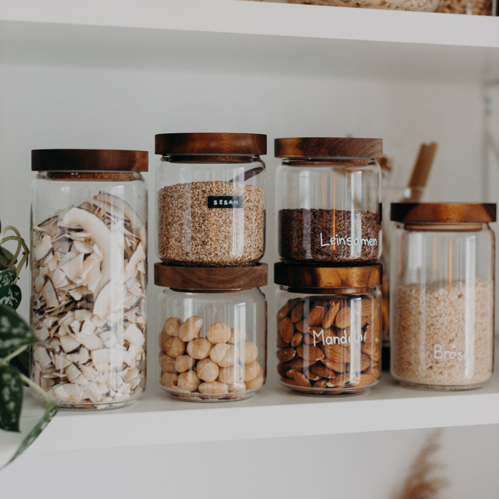 Mit aufgeräumten und übersichtlichen Vorräten macht Kochen gleich viel mehr Spaß! Deshalb gibt es unsere Vorratsgläser mit Akazienholzdeckel in vielen verschiedenen Größen - ob für Nüsse, Haferflocken, Linsen oder Spaghetti, jede Zutat in deiner Küche findet einen schönen Platz mit den runden Vorratsgläser, die noch dazu stapelbar sind. Damit der Inhalt luftdicht verschlossen bleibt, ist im Deckel eine Silikonring versteckt, den man nicht sieht, aber dafür sorgt, dass deine Vorräte lange genießbar bleiben.