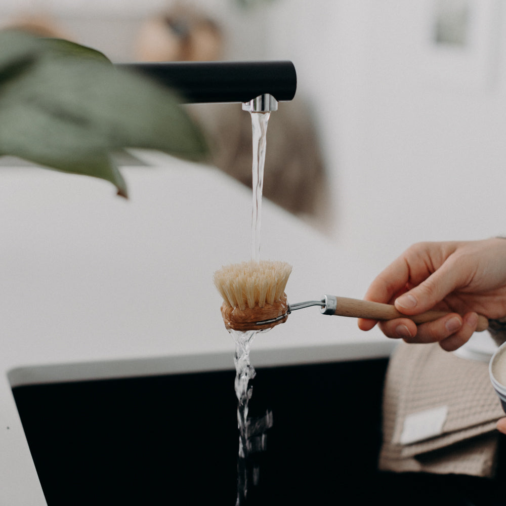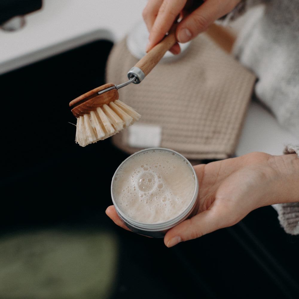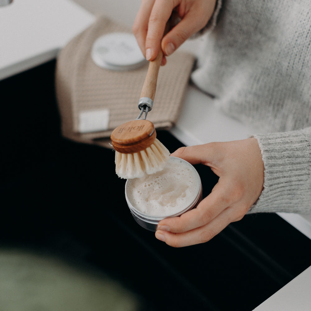 Für die Anwendung einfach die Spülbürste befeuchten und über die Seife reiben. Je nachdem, wie schmutzig die Flächen sind, die du reinigen möchtest, mehr oder weniger Menge Seife auf die Bürste auftragen.