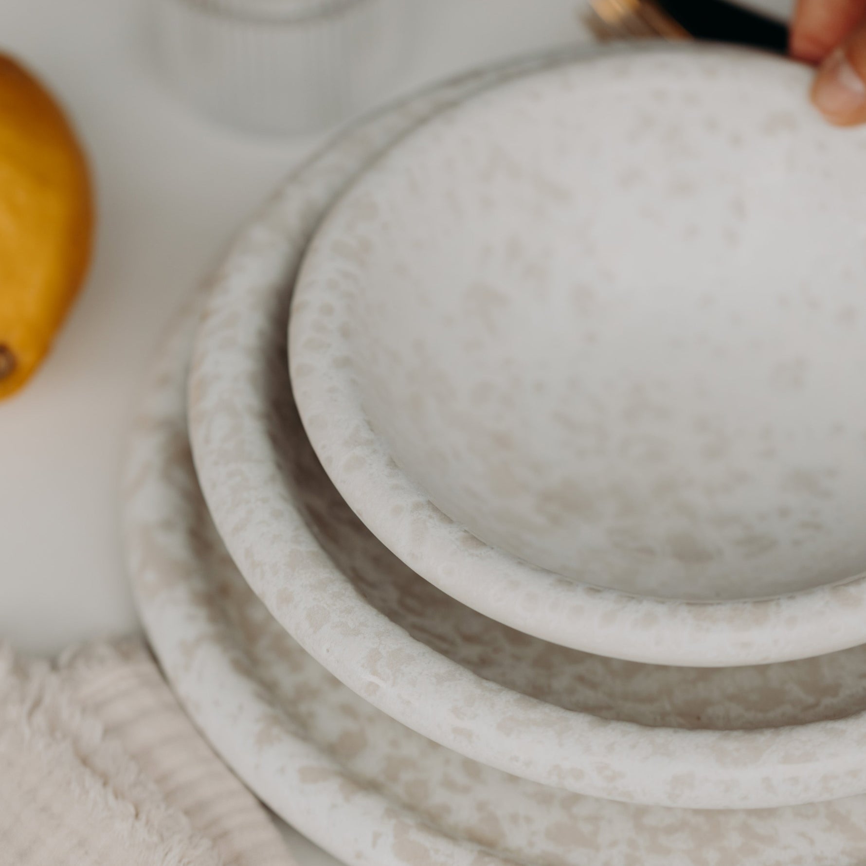 Feiner Besteckabrieb kann bei matten Glasuren mit der Zeit auftreten – er ist nur oberflächlich und lässt sich leicht mit Natron und einem weichen Tuch entfernen.