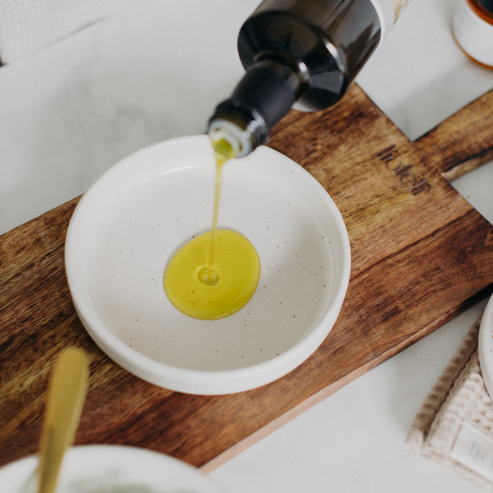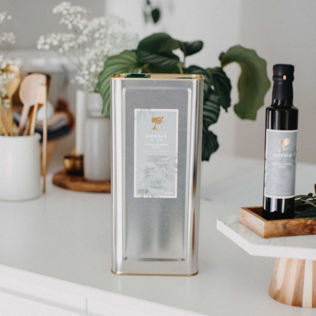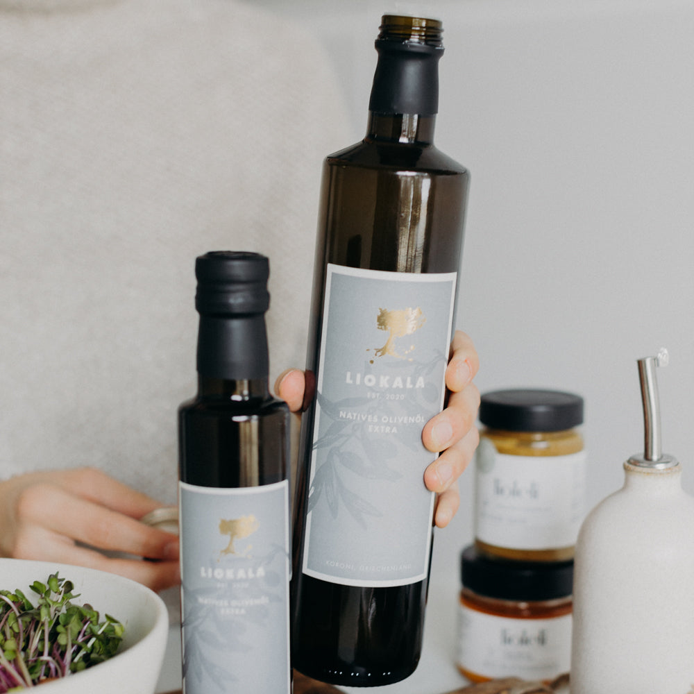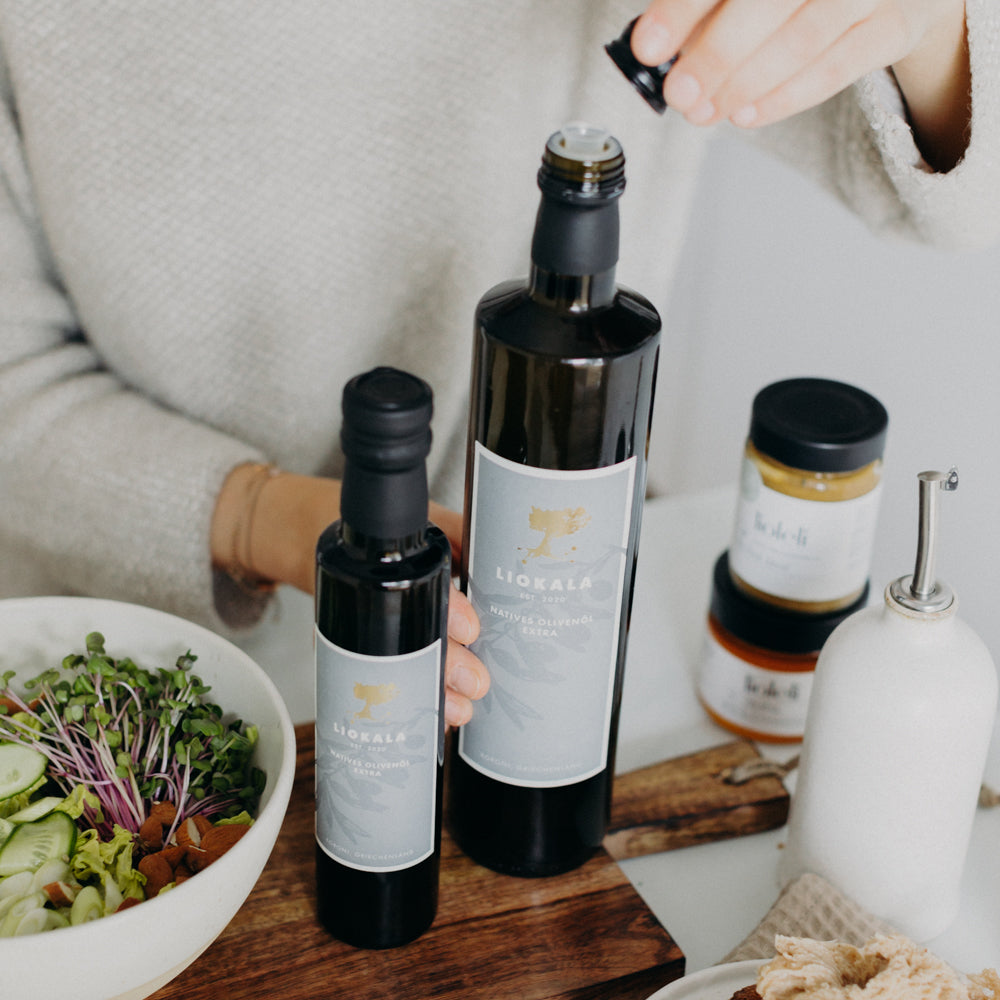 Unser LIOKALA Natives Olivenöl Extra ist ein limitiertes, in Koroni geerntetes und gepresstes Olivenöl aus zertifiziert biologischem Anbau. Es eignet sich optimal für die Zubereitung verschiedenster Speisen: zur Verfeinerung von Salaten, zum Anbraten von Gemüse, Fisch oder Fleisch oder auch nur - so wie wir es besonders lieben - zum Eintunken von Brot mit etwas Salz und Pfeffer.