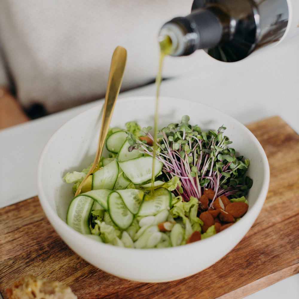Olivenöl kann sowohl in der kalten als auch in der warmen Küche verwendet werden. Es eignet sich optimal für die Zubereitung verschiedenster Speisen: zur Verfeinerung von Salaten, zum Anbraten von Gemüse, Fisch oder Fleisch oder auch nur - so wie wir es besonders lieben - zum Eintunken von Brot mit etwas Salz und Pfeffer. LIOKALA macht jede Speise zu etwas besonderem und die Flasche verschönert noch dazu jeden angerichteten Esstisch.